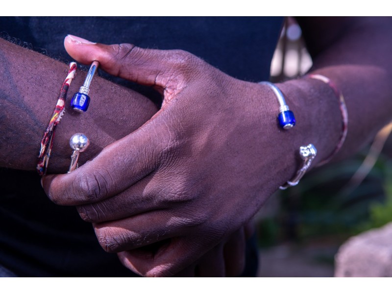 Deze flexibele zilveren slavenarmband met blauwe ingi boka kraal van Fokko Design heeft een stijlvol Surinaams design met een goede oog voor de details. Deze zilveren slavenarmband heeft een culturele betekenis.