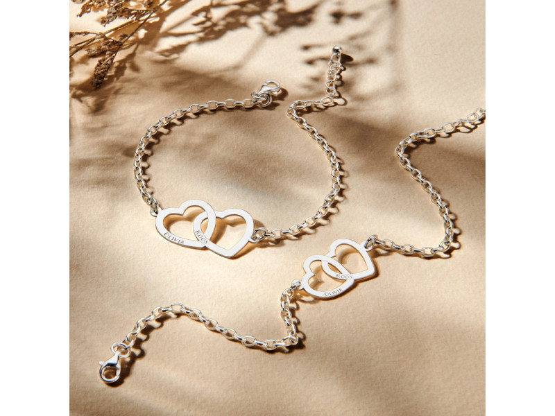 Deze prachtige moeder-dochter armbanden hebben twee hartjes in elkaar. Beide hartjes zijn te graveren met namen, of een naam en geboortedatum. Het is een leuke manier om de goede band weer te geven.